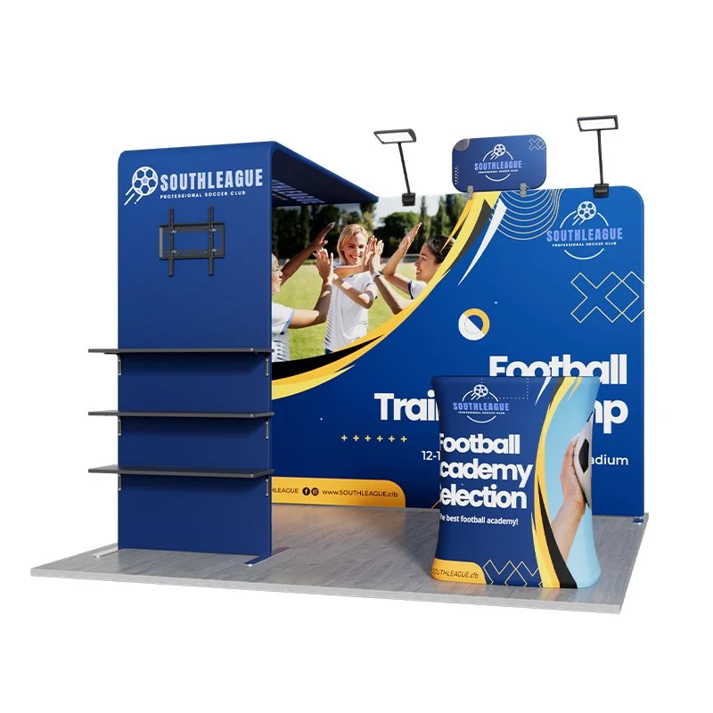 The two powerful 20W LED spotlights are strategically positioned to ensure your booth is well-lit, drawing maximum attention to your display and making your products stand out. The L-shaped stand, complete with a TV mount and a convenient three-tier shelf, adds a modern and stylish touch while significantly boosting both functionality and aesthetic appeal. Additionally, the square counter provides a dedicated and inviting space for face-to-face interactions with visitors, facilitating meaningful conversations and connections. Assembly is quick and hassle-free, thanks to the thoughtfully designed, easy-to-install components. This booth is carefully designed for maximum visibility and effortless setup, ensuring a polished, professional presentation without the stress or complications of complex installation. It’s an ideal solution for trade shows, exhibitions, and corporate events where first impressions truly matter.