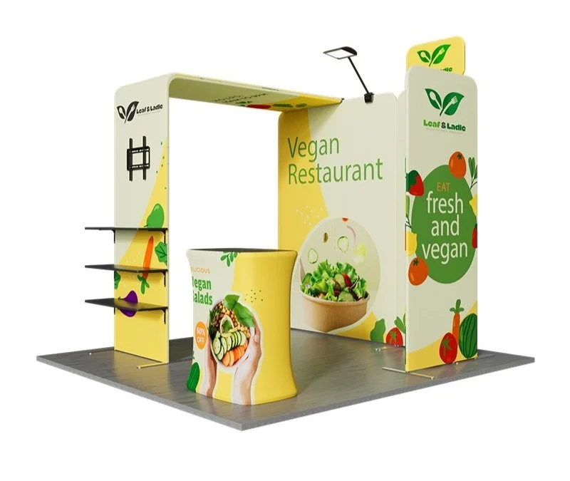 This custom 10x10ft trade show booth seamlessly blends modern design with practical functionality. Its sleek and contemporary look makes it a perfect fit for trade shows, exhibitions, corporate events, and more. Not only does it effectively showcase your products and brand, but it also creates a professional communication space that attracts attendees and enhances your event success.