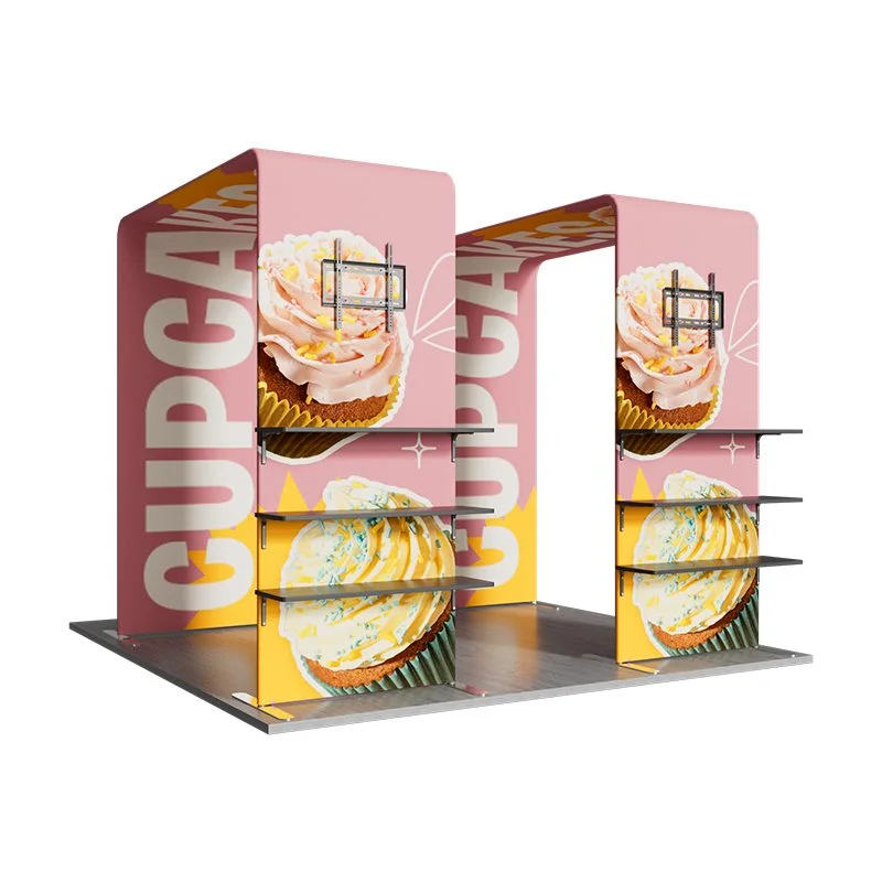 This booth is both versatile and practical. The two square arch displays create an open, multi-level exhibition space, featuring six shelves to provide ample display space for your various products. In addition, they can support two 26- to 55-inch TVs, perfect for multimedia presentations. Whether you're displaying product demo videos or brand promotional content, these displays will add visual appeal to your presentations. The straight display stand with rectangular header in the center further enhances the display effect and highlights the visual focus, making the whole booth display more outstanding.